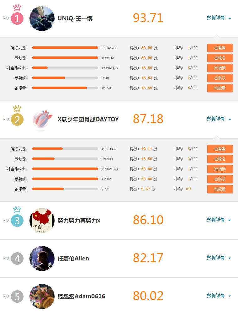 影响力就不用说了,王一博是真正当之无愧的顶流!在最新的明星势力榜中,稳坐榜首,力压肖战。(截图来自微博官方‘明星势力榜’2020.5.13)