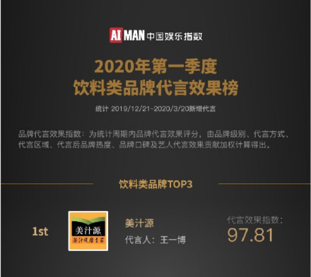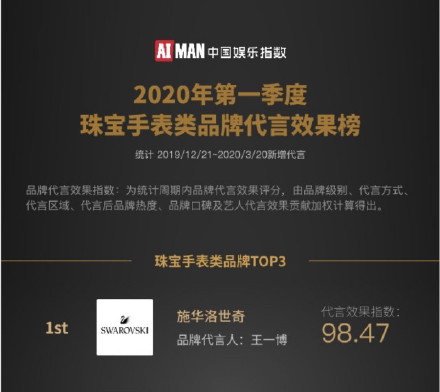 而王一博的带货能力,自然更是有目共睹的!从2020年第一季度品牌代言效果榜可以看出,王一博担任品牌代言人的施华洛世奇和美汁源分别以98.47和97.81的代言效果指数, 登顶珠宝手表类与饮料类品牌代言效果双榜top1!