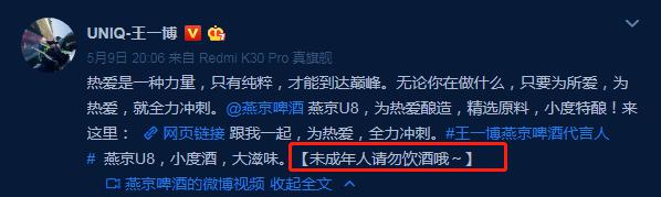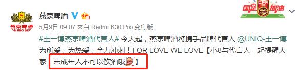 另外小编特别注意到,此次不管是品牌方还是王一博个人,在微博官宣的时候,都特意说明了一句【未成年人请勿饮酒哦~】小细节真的满分!