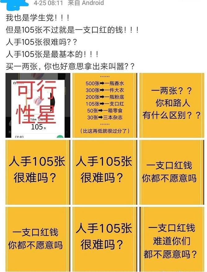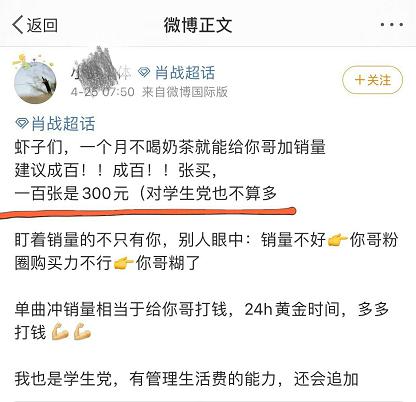 顺便对比隔壁家爱豆肖战,肖战家的部分粉丝,号召没有收入来源的未成年人(其中不乏很多小学生),大量重复购买其新专辑,号称“不然就不是真的爱哥哥,不承认不买专辑的粉丝的粉籍!”真的是高下立见了。