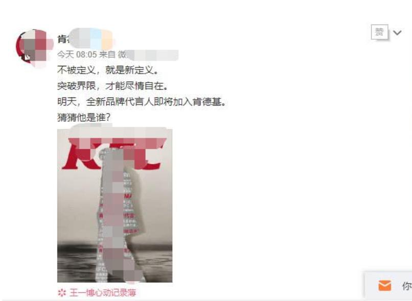 粉丝在互联网上看到一个图片,疑似王一博代言了肯德基,众所周知,在快餐领域,肯德基的地位是无法被撼动的,作为年轻一代最喜欢的快餐品牌,在全国的影响力也是巨大的,虽然代言照片被模糊处理,但是喜爱王一博的粉丝,一眼就看出,这就是他们的爱豆。