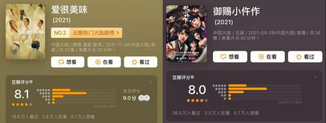 2021也是“黑马”频频跑出的一年,《御赐小仵作》和《爱很美味》豆瓣评分都超过8分,排在年度前十位。