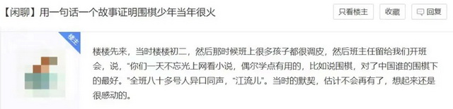 但曾经的观众长大后,微小的感动也会变得弥足珍贵。《围棋少年》没有准确的播放量或收视率数字,同名贴吧中有粉丝发起“用一句话一个故事证明围棋少年当年很火”,并在跟帖中回忆说,曾被班主任问“中国谁围棋下得最好”,全班80多人异口同声喊“江流儿”。