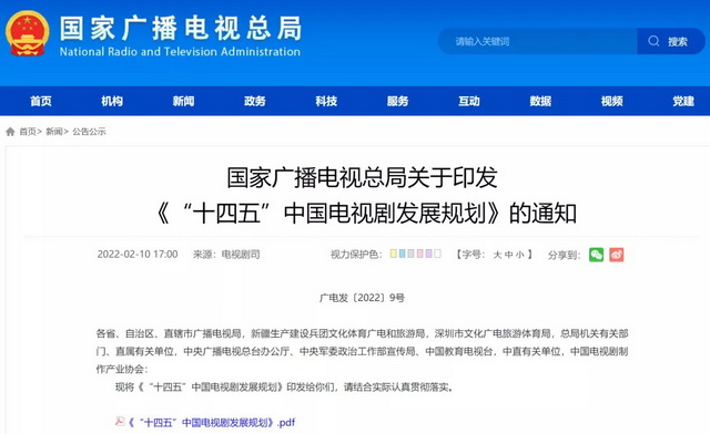 大事发生。2月10日,国家广播电视总局正式印发了《“十四五”中国电视剧发展规划》(下文简称《规划》)。
