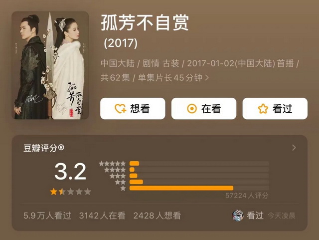 演员拿了极高的片酬,但却没有回馈同等的劳动。Angelababy在2016年播出的古装剧《孤芳不自赏》被曝出片酬8000万的消息。该剧豆瓣评分仅有3.2,还因为孕期拍摄,很多画面都是在棚内以近景的方式完成,再靠后期进行处理,深陷“抠图门”。