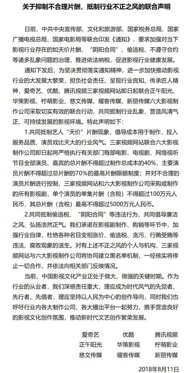 此后,市场也迅速给出响应。2018年8月11日,爱优腾三家平台联合正午阳光、华策影视、柠萌影业、慈文传媒、耀客传媒、新丽传媒六大影视制作公司,共同发布了《关于抑制不合理片酬,抵制行业不正之风的联合声明》,声明电视剧单个演员的单集片酬不得超过100万元(含税),其总片酬不得超过5000万元(含税)。