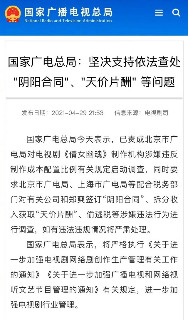 这也是此次限薪能引起如此大反响的原因,《规划》不仅对演员片酬进行了严格限制,在对具体执行的监管层面,也做出了明确规定:“健全事前事中事后全链条全流程监管机制,严肃处理有偷逃税、“阴阳合同”、“天价片酬”等违法违规行为的演员和相关机构。”