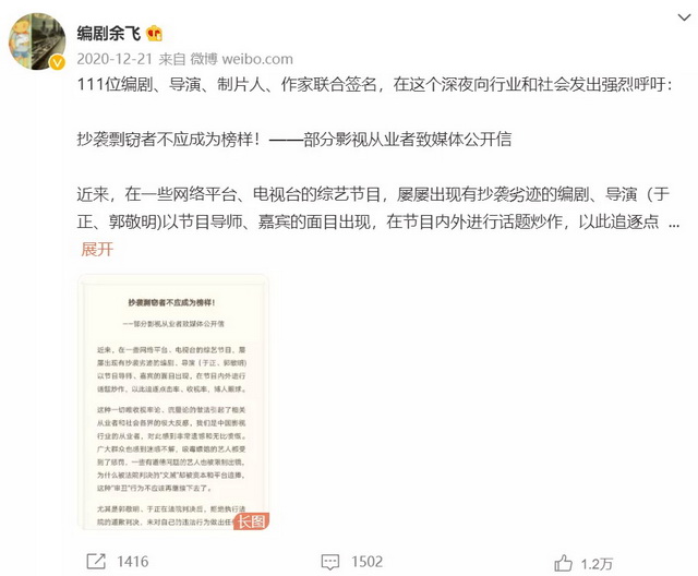 2020年年底,编剧余飞、宋方金在微博发布名为《抄袭剽窃者不应成为榜样!》的联名公开信,共156位影视从业者联合署名,集体维权。随后,郭敬明和于正接连为了已经过去多年的抄袭风波道歉。这一事件让编剧行业正在经历的乱象再次浮出水面,引发大众讨论。