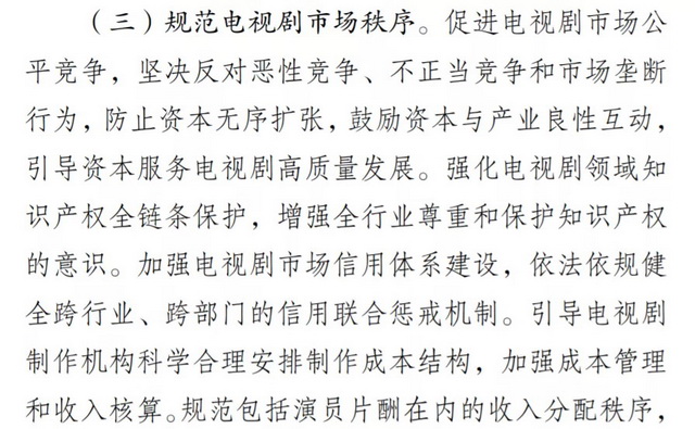 为了解决这一问题,2017年10月,中国广播电影电视社会组织联合会电视制片委员会等四家协会就联合发布了《关于电视剧网络剧制作成本配置比例的意见》(下文简称《意见》),明确指出“全部演员总片酬不得超过制作总成本的40%” 。