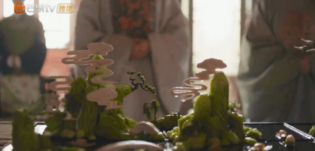 在前期,美食团队还在食物的摆盘、雕刻上与美术团队沟通了很多。古籍对菜肴的记载多为食材、烹饪步骤,食物的摆盘和雕刻资料甚少。美食团队也因此聘请了多位非遗传承人和国宴大师,来专门做食物的雕刻工作,“比如剧中出现过的雕花、雕鱼,最复杂的就是赏花宴上复原的雕刻冷盘《辋川图》,六七个雕刻师傅,每天十几个小时,花了整整7天才做完。”