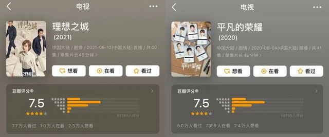 也不是没有想认真讲行业的职场剧,但目前看来,似乎不谈恋爱、不讲精英和不悬浮,也不能拯救国产职场剧。不信看看《理想之城》和《平凡的荣耀》,这两部剧规避了上述所说的问题,也双双在豆瓣开出7.5分的好成绩,但打分人数都没过十万,离真正的“爆款剧”还差N个热搜。