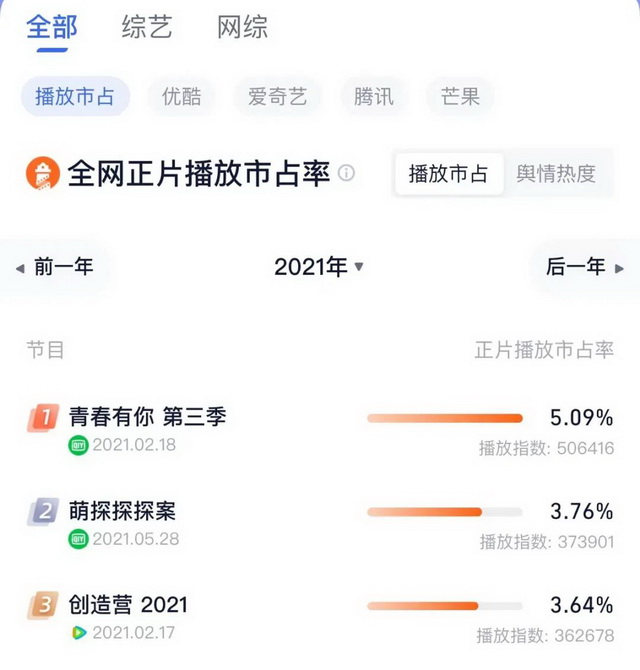 但是,毒眸(ID:DomoreDumou)也注意到,从综艺市场的角度来说,每年春天的101选秀都是能够拉高大盘的重中之重。无论是节目热度还是会员拉新,一季度的选秀综艺都应该是平台全年综艺的“高光时刻”。