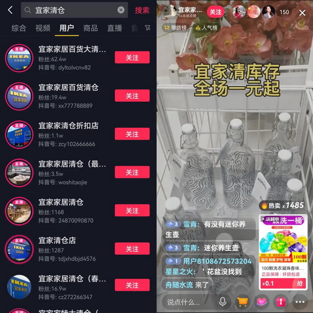 同样的场景,在上百个直播间里重复上演。在抖音上搜索“宜家清仓”、“山姆清仓”等,会出现至少七八十个相关账号——它们几乎都是个人注册账号,但点进直播间,画面是在宜家卖场、山姆会员店内,简单粗暴的大字标明直播间是“宜家/山姆清仓”,主播神龙见首不见尾,只出现了一个声音。