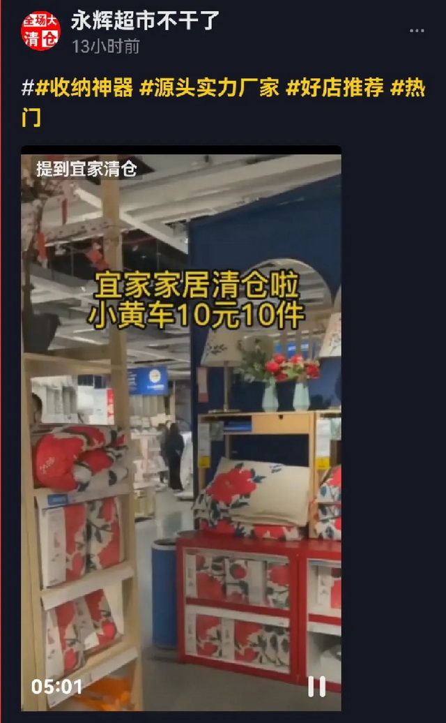 直播间场景显示的是宜家卖场,顾客在镜头前来来往往,几个大字表明了直播间是做什么的:宜家清库存,全场一元起。