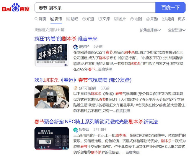 以“春节 剧本杀”为例,对关键词检索后,便能发现大量春节期间剧本杀商业模式的创新,比如一些地区已经开展了送货到家的剧本外卖业务,消费者足不出户就能满足社交需求。至于《王者荣耀》、抖快、滑雪等对手,显然不是今年才开始分流影院生意的,春节社交市场早就从“一家独大”,变成百花齐放了。