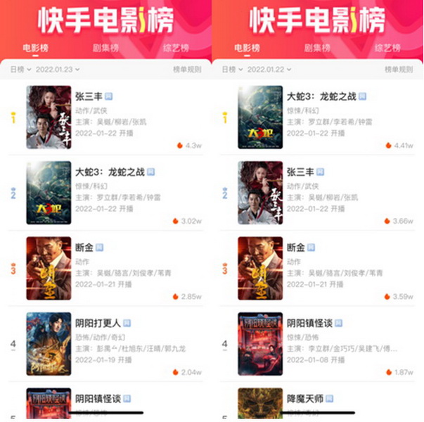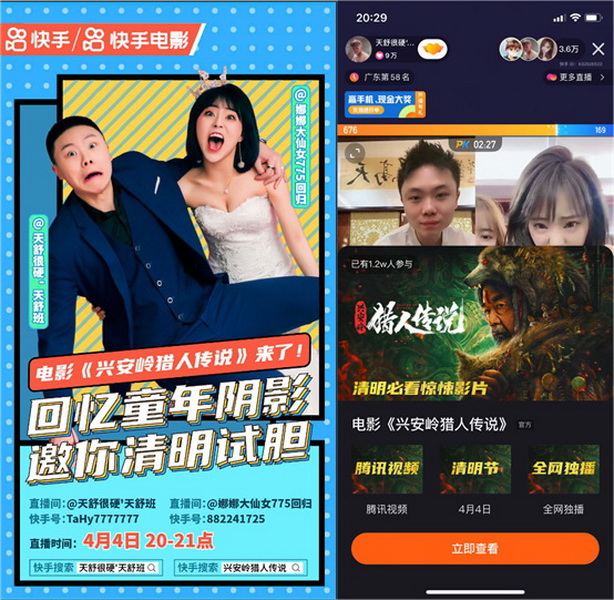 这一年来,快手在产品端开辟“征稿带转化组件”,让其宣发具备了得天独厚的优势;玩法上,明星X达人直播、电商类主播XIP直播、主演直播,网络电影直播合作已经常态化,而且玩法多样,一直在推陈出新;合作影片的类型边界也在不断拓展,喜剧(《发财日记》《新逃学威龙》《四平警事之尖峰时刻》)、惊悚悬疑(《黄庙村·地宫美人》《水怪黑木林》《阴阳镇怪谈》《卸岭秘录》《黄皮幽冢》)、怪兽灾难(《大蛇3》)、主旋律(《浴血无名川》《绝对忠诚之国家利益》)、动作类型(《雷霆行动》《狙击之王》)等各种题材类型,在快手均有突出表现。