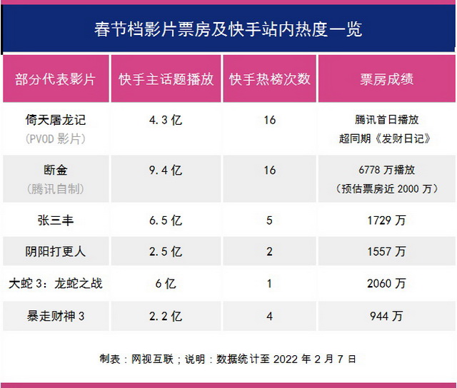 2022春节期间,快手以“网上看电影一起过大年”为活动主题,与至少11部影片进行了官方宣发合作,这里面不少影片票房分账都突破了1000万。比如,以PVOD模式上线的王晶新片《倚天屠龙记之九阳神功》《倚天屠龙记之圣火雄风》,经典IP《张三丰》,怪兽厂牌《大蛇3:龙蛇之战》,以及《阴阳打更人》《断金》等,快手基本上实现了2022春节档网络电影合作的全覆盖。