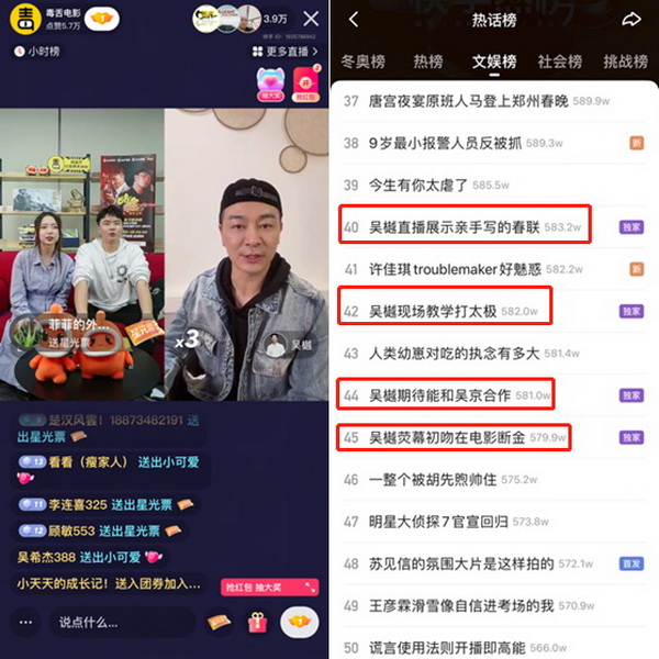 此外,快手邀请头部影视大V毒舌电影担任好片推荐官,与影片主创进行系列直播,也取得了非常好的传播效果,单场最高同时在线人数10w+,产生10+快手热点。其中,毒舌电影x吴樾(快手ID:2340257976)《断金》直播总观看100万+,最高同时在线8万+;毒舌电影x吴樾《张三丰》直播总观看200万+,最高同时在线10万+。