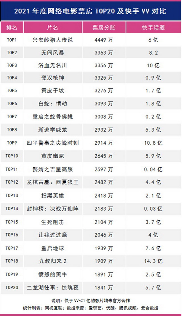 2021年全年快手重点合作网络电影100+部,在2021年度票房榜TOP20中,快手官方合作16部,合作率高达80%。快手的营销生态,已经成为了网络电影的增量战场。