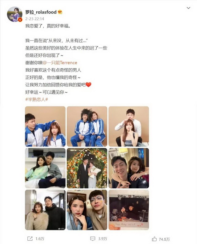 刚刚结束的《半熟恋人》里,热度最高的CP罗拉和王能能,分别在微博拥有170万和90万粉丝。罗拉发布的官宣恋情的微博,获得了近75万次的点赞。按照时间来看,现在属于CP粉的“蜜月期”,这种“正主发糖”的快感,在明星身上是很难感受到的(除非你是邓超和孙俪的CP粉)。
