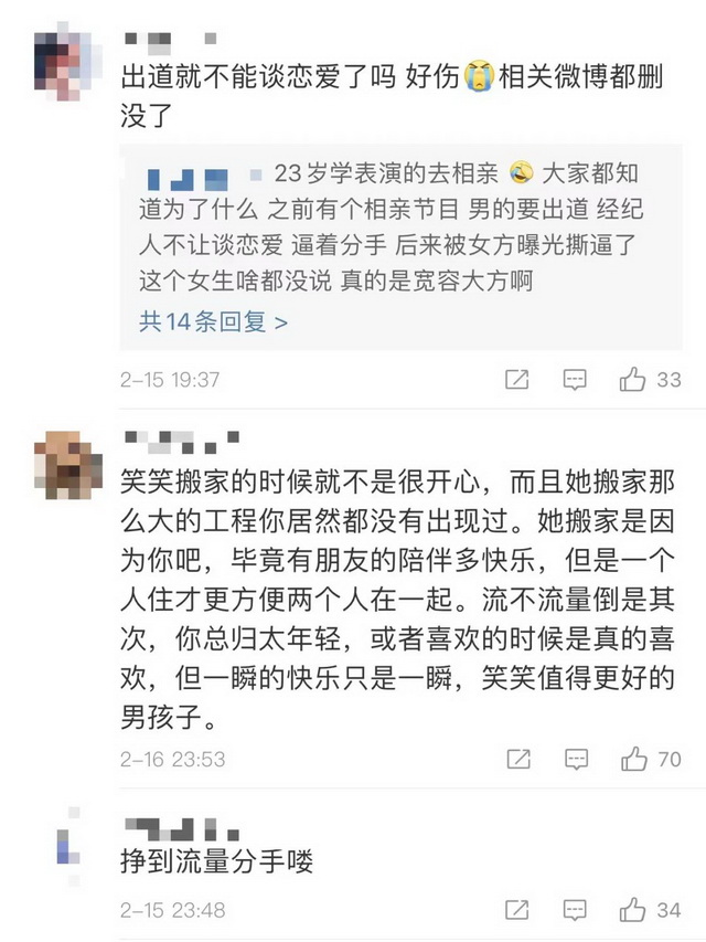 《90婚介所》热度最高的CP刘天杨和韩笑近日被传分手,原因是刘天杨加入了微博的“青云计划”并正式出道,成为一名演员。目前他的微博已经没有韩笑的相关内容,在最新一条微博下方的评论区里,几乎都是CP粉的控诉,“出道就不能谈恋爱了吗?”“挣到流量就分手咯。”