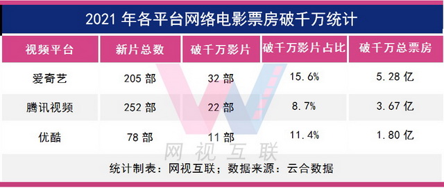 值得一提的是,2021年爱腾优上新网络电影公开分账票房总规模为19.6亿,如果加上PVOD影片、自制非分账影片、其他平台影片以及因票房不好未公开票房的影片,预计整体市场规模已超30亿。