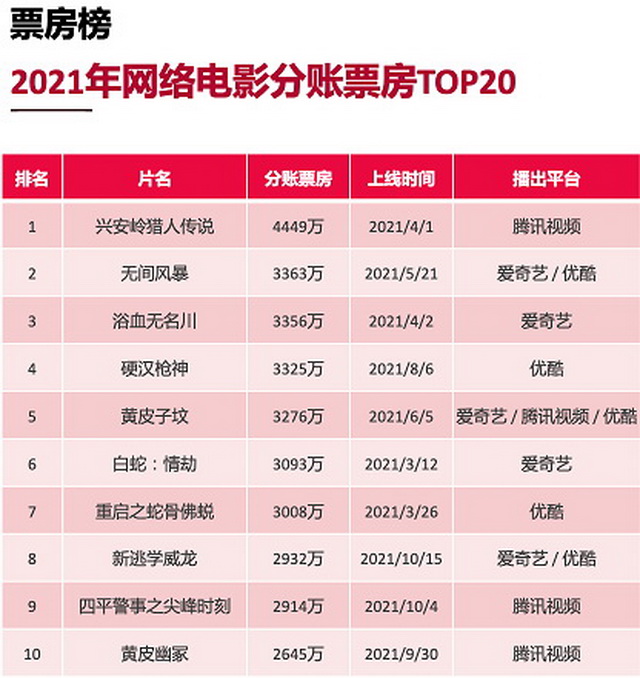 就单片票房来看,2021的票房冠军为腾讯视频独播的《兴安岭猎人传说》,分账票房4449万,网络电影依然未能打破票房天花板。