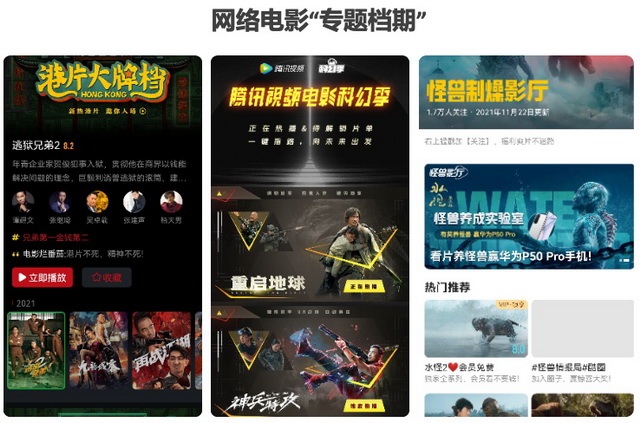 腾讯视频也积极调整内容规划和激励策略,对每月前五名作品额外给予一定的现金奖励。并推出了针对网络电影的广告资源服务,帮助提升曝光及票房。