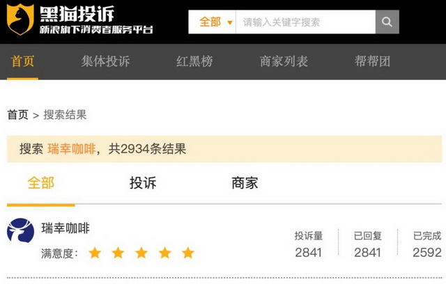 △黑猫投诉平台上瑞幸咖啡的投诉量高达2841条