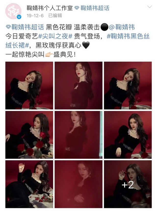 那一年年底的爱奇艺尖叫之夜,鞠婧祎身穿丝绒黑裙,以精致的复古妆容亮相,成为当晚娱乐话题的焦点。那张红毯上面对镜头勾唇微笑的动图,也成为盘点红毯造型时必被提起的神图之一。