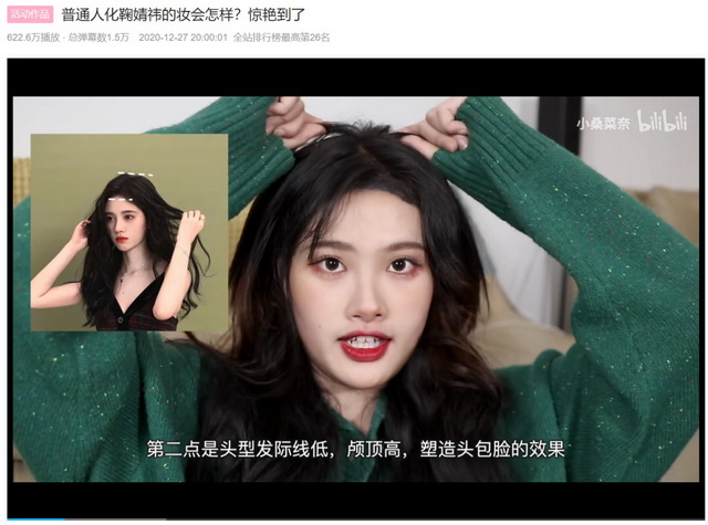 B站百万粉丝的UP主“小桑菜奈”有一支鞠婧祎仿妆视频,播放超过600万,而这支视频的标题已经很好地说明了大众的关注点:《普通人化鞠婧祎的妆会怎样?惊艳到了》。