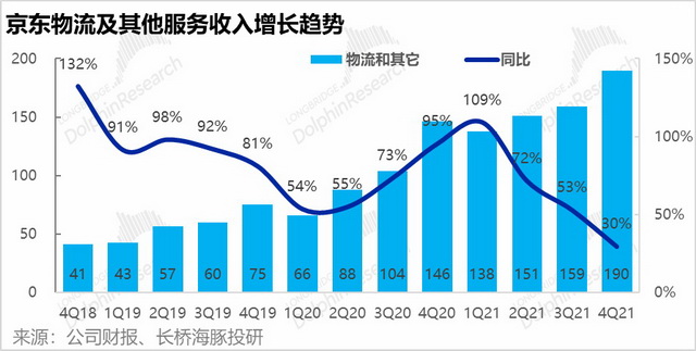 能否帮商家做好生意,是作为零售平台的核心命题。自营与开放平台的不同之处在于,自营属于零售业,赚的是进销差价;开放平台属于互联网业务,赚的是服务费/佣金/广告费,毛利率要高一个数量级。而从财报数据来看,21年Q4京东自营业务同比增长27%,POP业务(第三方业务)同比增长滑落到40%以下,低于上一季度49%的增速。