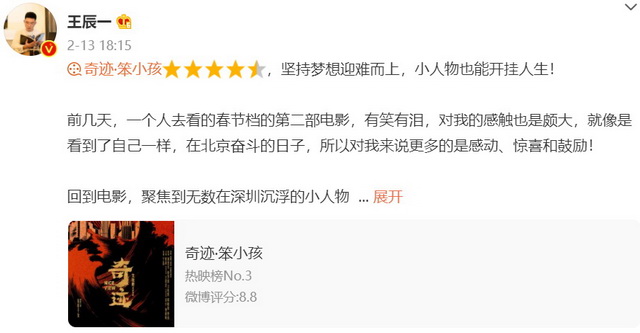 在调动全站影评热议、口碑发酵上,微博设置大V影评排行榜,邀请不同领域大V多角度解读电影。以《奇迹·笨小孩》为例,情感博主@王辰一 分享的观影感受受到网友一致认同,此外,明星联动打call、话题征稿包等方式一起协力推动了口碑发酵。在大年初五弯道超车,实现了单日票房逆袭。