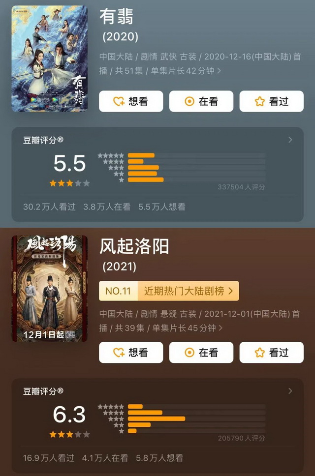 大多数唱跳偶像的归宿都是影视城,但演戏不是唱跳偶像专攻的领域,最终呈现出的结果很难收获良好的口碑。乐华现今最大的“摇钱树”王一博,在演技上就屡次陷入负面争议,《陈情令》之后播出的两部剧集《有翡》和《风起洛阳》,前者豆瓣评分仅为5.5,后者达到6.3,堪堪踩上及格线。