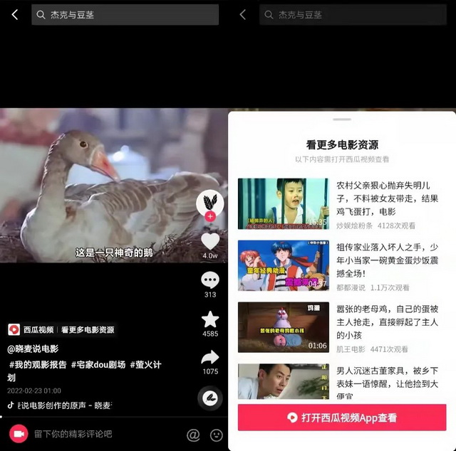虽然现在在抖音上无法直接观看电影,但是在部分影视解说内容中会挂有西瓜视频的链接,以用户瞬时的观看欲望引导用户下载,将长视频观看渠道转移至西瓜视频。西瓜视频也在以内容采买这种更快速有效的方式填充内容库以便留存用户。