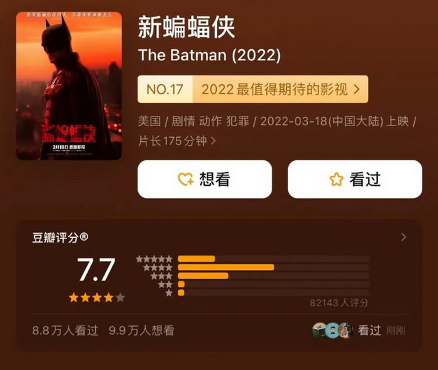 截至3月17日,上映两周的《新蝙蝠侠》全球成绩为4.79亿美元。国内首日票房2132.3万,场均人次仅7人,首周末票房7445.6万。以目前的走势来看,它很难像DC上一部风格相似的漫改电影《小丑》那样,斩获10亿美元以上。