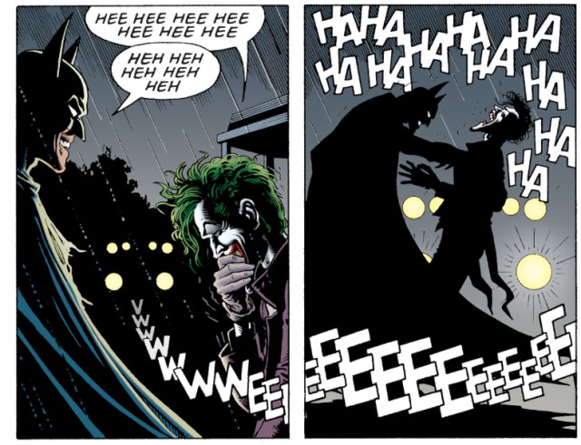阿兰·摩尔的《致命玩笑》则重塑了蝙蝠侠最重要对手小丑的起源故事,“只需要最糟糕的一天,人人皆可成为小丑”这一理念,后来基本成为了角色的固定底色,故事最后,蝙蝠侠和小丑对视狂笑又确定了两人就是硬币两面的关系,这同样成为后来蝙蝠侠故事的重要素材。