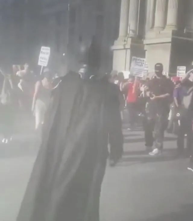 在美学表征上,诺兰是出了名的“实拍狂魔”,在摄影棚里搭建蝙蝠洞,小丑要炸哥谭医院就是真炸毁了芝加哥一座废弃工厂,他布置的故事舞台就是一座冷峻的钢铁丛林,有高耸入云的大楼也有肮脏混乱的街巷,在这个舞台上发生的一切对观众来说似乎都有了实感。而在主题层面,《黑暗骑士》所提的“电车难题”,《黑暗骑士崛起》所展现的阶级落差,都是现实矛盾的放大版。这也是为什么当现实偶尔“魔幻”时,和电影会非常相似,2020年美国爆发大规模游行,抗议人员身穿蝙蝠侠服装走上街头就成为了社交媒体热点。