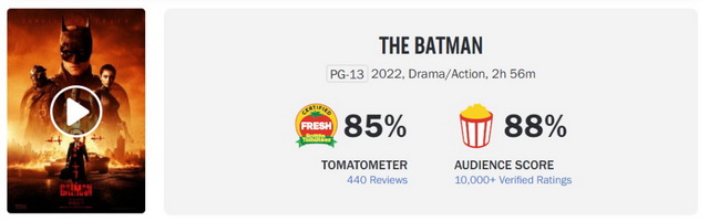 从口碑来看,《新蝙蝠侠》的烂番茄新鲜度达到85%,低于《蝙蝠侠:黑暗骑士》(94%)但与另两部诺兰作品相仿,且远高于《蝙蝠侠大战超人:正义黎明》(29%)和院线版《正义联盟》(40%),当然扎克·施奈德重剪的《正义联盟》风评稍好(71%)。同时《新蝙蝠侠》也获得入场影迷的肯定,在CinemaScore上的得分达到A-。从观众构成看,《新蝙蝠侠》的购票人群中男性占比达到65%,而且60%为18到34岁的年轻受众。