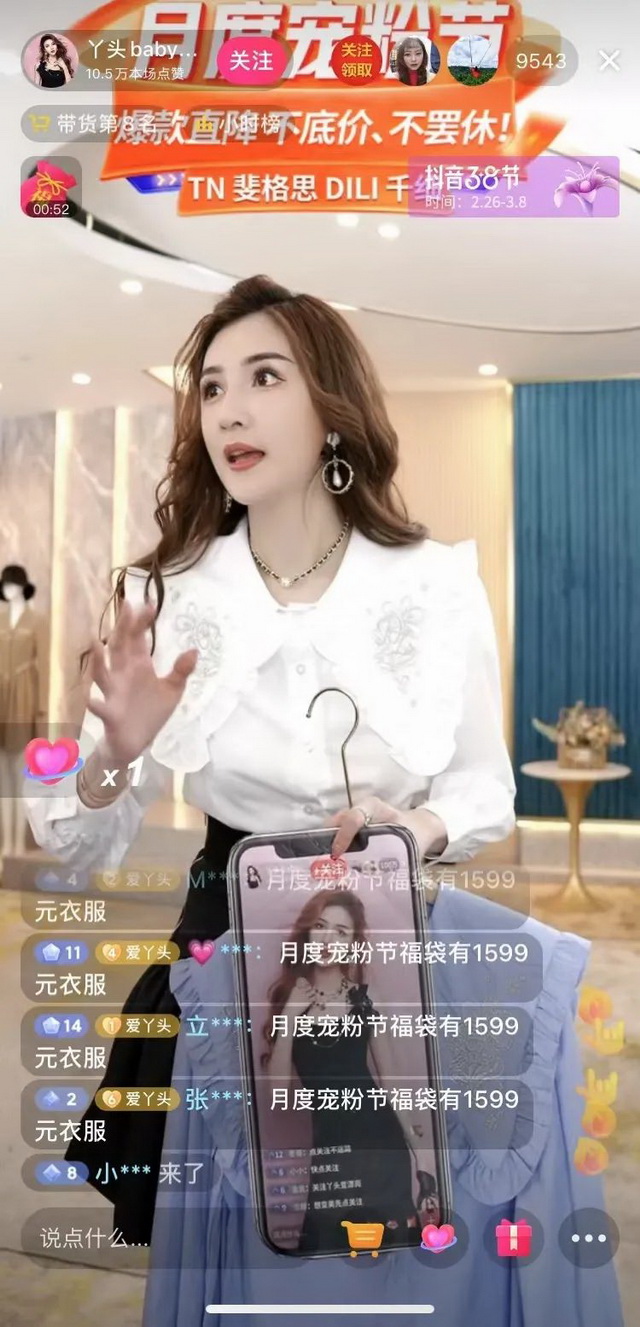 和恩佳有着相似经历的丫头baby ,也是抖音电商服饰品类的带货达人。她从考虑到决定加入抖音电商的时间,只有短短9天,但是开局不足两个月,便取得了惊人的带货战绩。在粉丝量不足2万的情况下,丫头baby单场销售额便突破了千万元,平均单场观看人数甚至超过了150万。