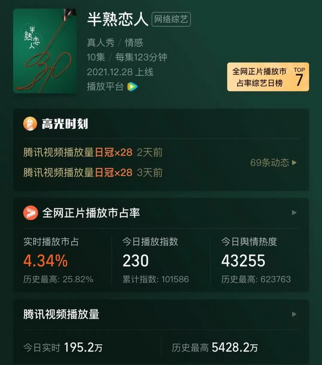 据云合数据,《半熟恋人》正片有效播放量破两亿,是2021年度恋综赛道top2,仅次于腾讯视频另一档恋综《心动的信号4》。正片有效播放量位居2021年12月上线综艺TOP1,是2021年恋综赛道中唯二正片有效播放量破2亿的节目,且收官后伴随番外的播出和超长售后,节目稳居云合数据网综霸屏榜日榜TOP1。