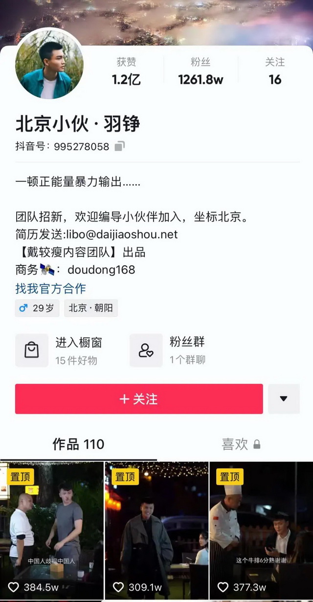 @北京小伙·羽铮 在抖音坐拥1200w+的粉丝,点赞量超过1亿,他的内容捕捉了生活中的片段与感悟,将“接地气”的话题讲述得真诚与震撼。他会反驳大学生对回农村建设行为的不屑、会反击在约会中无理取闹的女朋友、会怒怼相亲女对摆摊工作者的职业偏见……而这一切都是生活在这个世界的平凡人正在经历的故事。
