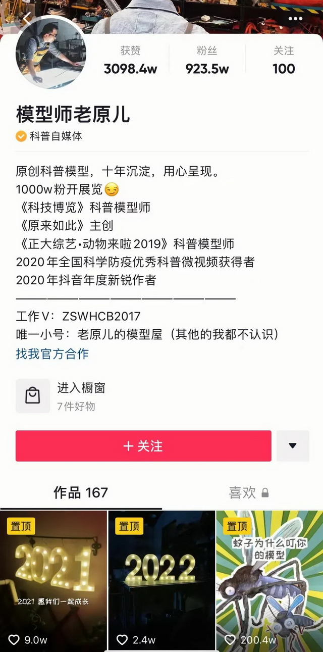 @模型师老原儿 本名叫宁原,曾经是央视科普节目的出镜实验员,随后致力于通过短视频让每个人都能理解“高深”的知识。小龙虾的生理构造是怎样的?蚊子为啥叮你?这些生活中随处可见的小生物背后隐藏着许多不为人知的秘密,而@模型师老原儿 让这些知识变得通俗易懂、妙趣横生。用他自己的话说:“既能让小学生看懂,也能让成年人感到有趣,这才是成功的科普视频。”