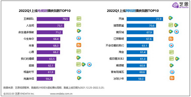艺恩数据的一季度剧集报告,也记录了台网大剧与网播黑马剧的热度。在2022Q1上线电视剧播映指数TOP10中,其中《王牌部队》《人世间》《心居》跻身前六;而在2022Q1上线网络剧播映指数TOP10中,悬疑剧创新制作《猎罪图鉴》《淘金》亦榜上有名。