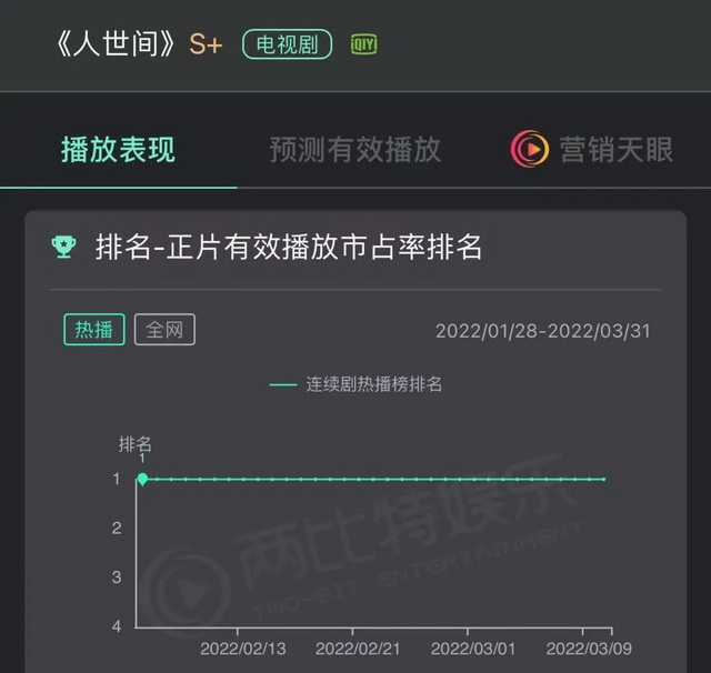 但数据证明,这部剧在热度上并不输阵。在电视端,它创下了央视一套近五年来电视剧收视新高;在视频平台端,它是爱奇艺史上第三部热度突破10000的剧。云合数据发布的2月电视剧正片有效播放榜单中,《人世间》也以17.59亿的流量断层领先。