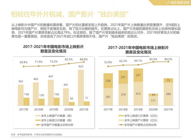 其中,国产片的票房占比显著提高。《白皮书》显示,2021年国产片贡献的票房占比高达79%。其中包括三部超过45亿的重磅大片,即《长津湖》《你好,李焕英》和《唐人街探案3》。