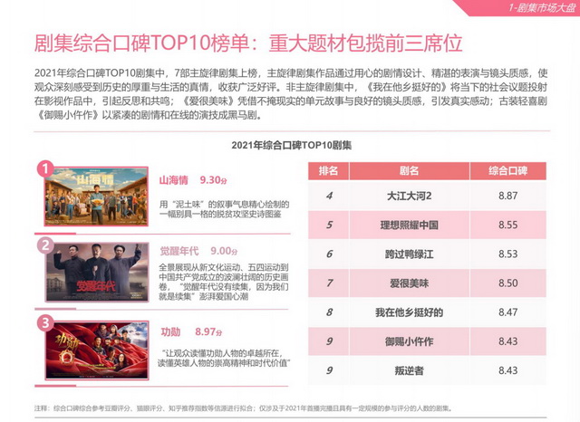 在受众口味呈现圈层化和垂直化的当下,主旋律题材成为了最能够穿透圈层的题材品类。电影市场有拿下影史票房冠军的《长津湖》,剧集市场的年度综合口碑TOP10剧集中,前三名的《山海情》《觉醒年代》《功勋》均为主旋律题材。