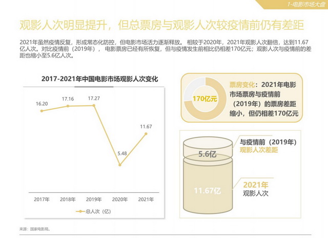 电影市场方面,2021国内全年电影总票房达到472.58亿元,再度成为全球票房第一,观影人次也达到了11.67亿人次,恢复至疫情前近七成水平,银幕数量也在增加,到2021年9月底,中国电影市场的银幕数量正式突破8万块大关。