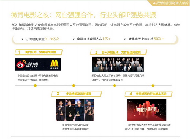 在下游,顺应电影市场的档期集聚效应,微博也在重点档期推出了营销产品矩阵,为档期影片提供联合营销的土壤。以2021年春节档为例,话题总增量达到了500亿以上,视频播放量达到了61亿以上。