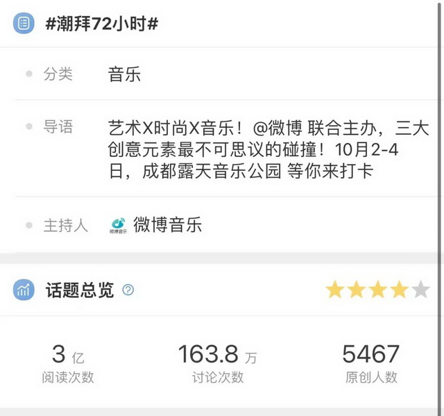 在音乐行业,微博既是线上传播的营销平台,又是线上演出的内容平台,在漫长的疫情常态化时期帮助演出行业打破与观众的信息传播壁垒。比如微博联合主办的“潮拜72小时音乐节”,主打线上线下的融合体验,乐迷既可以线上观看直播,也可以亲自线下打卡。#潮拜72小时#话题总阅读量达到3亿,讨论度163万。